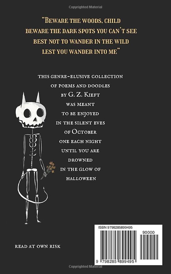 A genre-elusive collection of poems and doodles was meant to be enjoyed in the silent eves of October, one each night, until you are drowned in the glow of Halloween.