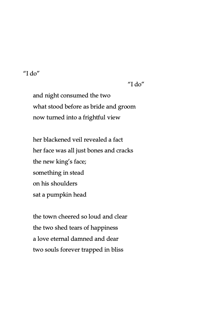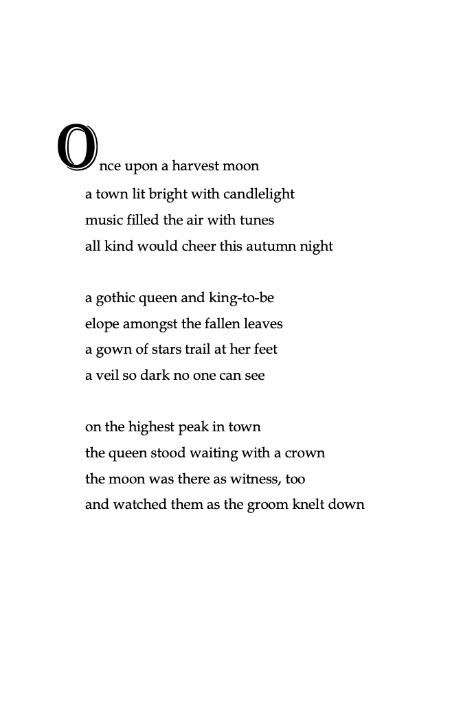 You’ll read whimsical stories about haunted forests, terrifying tales of carnivores in carnivals, love stories about gothic queens and pumpkin kings, mythical retellings of Greek fables, as well as darker reflections on depression and life after death.