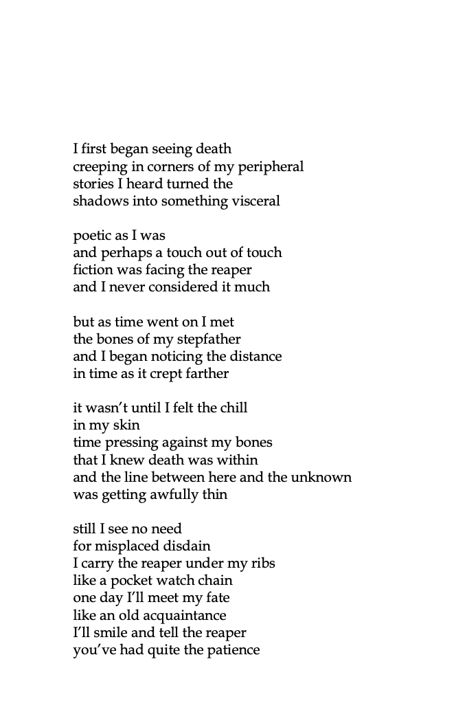 Bone Nuit is a play on the french phrase bonne nuit, meaning good night. I wrote my first poem for this book in a cafe in Portland, OR, inspired by the complex duality of Halloween. Celebrating the things in life that scare us. Tinkering with themes that are objectively horrible yet come to life in playful and creative ways.